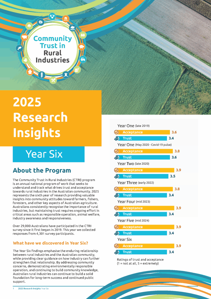 DownloadThe Community Trust in Rural Industries (CTRI) program is an annual national program of work that seeks to understand and track what drives trust and acceptance towards rural industries in the Australian community. 2025 represents the sixth year of research providing valuable insights into community attitudes toward farmers, fishers, foresters, and other key aspects of Australian agriculture. Australians consistently recognise the importance of rural industries, but maintaining trust requires ongoing effort in critical areas such as responsible operation, animal welfare, industry awareness and responsiveness.