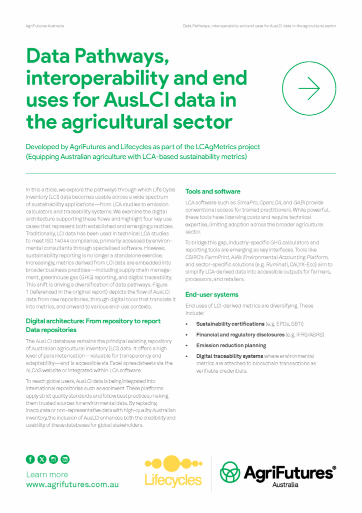 This document, developed by AgriFutures and Lifecycles as part of the LCAgMetrics project, explores how Life Cycle Inventory (LCI) data, specifically from the AusLCI database, is utilised in the agricultural sector for sustainability applications. ​ It highlights the digital architecture and pathways through which AusLCI data is transformed into actionable metrics for various end uses, including sustainability certifications, financial disclosures, emission reduction planning and digital traceability systems. ​
