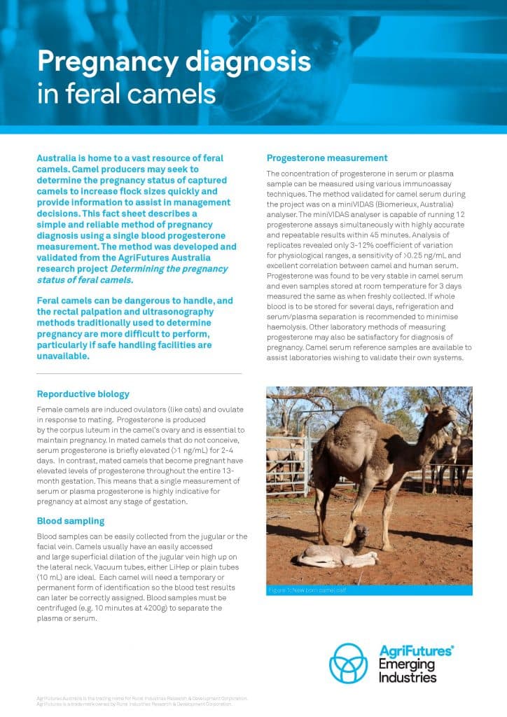 DownloadThis project describes the development and validation of a simple blood test for pregnancy detection in camels that can be performed safely, efficiently, and reliably at the point of capture. A simple method for obtaining blood from the jugular or facial vein of a camel and then analysing the serum or plasma for progesterone levels using a portable immunoassay analyser (miniVIDAS®) is described. This method both improves handler safety and the accuracy of pregnancy detection in camels.