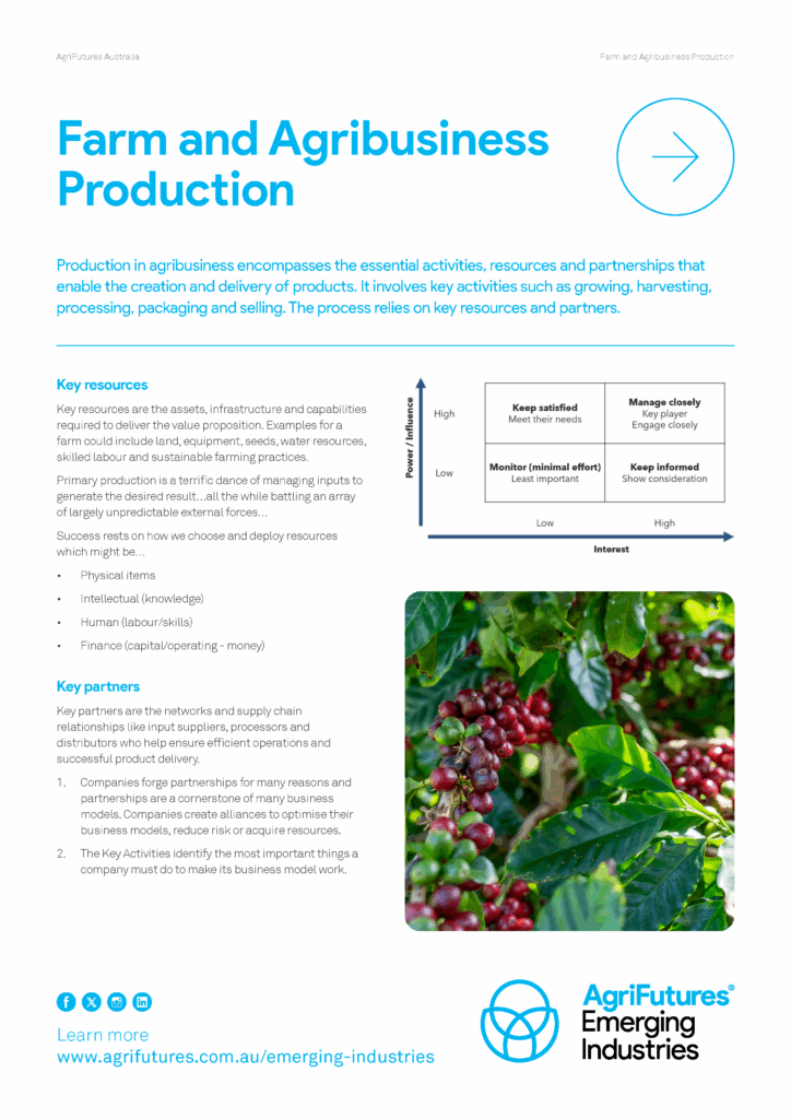 Production in agribusiness encompasses the essential activities, resources and partnerships that enable the creation and delivery of products. It involves key activities such as growing, harvesting, processing, packaging and selling. The process relies on key resources and partners