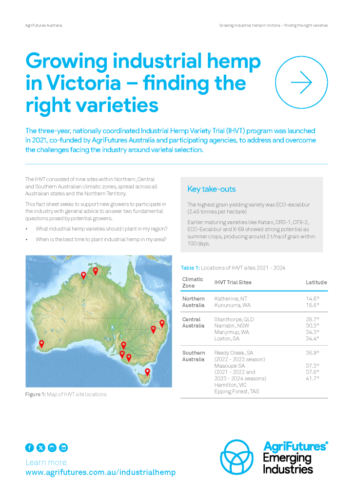 The three-year, nationally coordinated Industrial Hemp Variety Trial (IHVT) program was launched in 2021, co-funded by AgriFutures Australia and participating agencies, to address and overcome the challenges facing the industry around varietal selection.