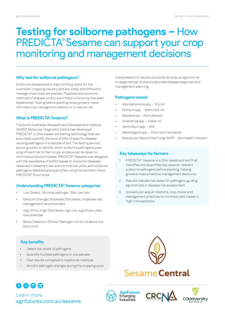 This factsheet introduces PREDICTA® Sesame, a DNA‑based soil test that helps growers detect and quantify key soilborne pathogens before planting. It explains why early testing is essential—soil diseases are costly, hard to control once crops are in the ground and can significantly impact sesame productivity.