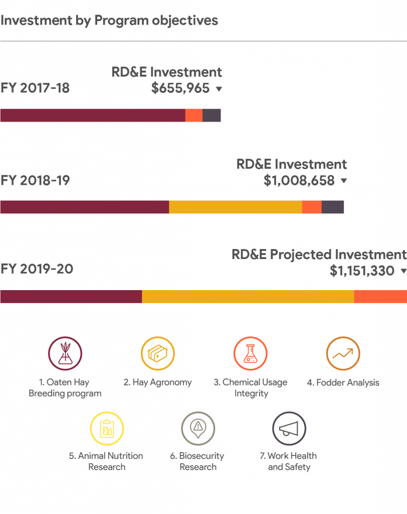 Key components of this program include further developing the Oaten Hay Breeding program, continuing to grow hay production, and ensuring that export fodder meets importing country requirements with regards to chemical residue.